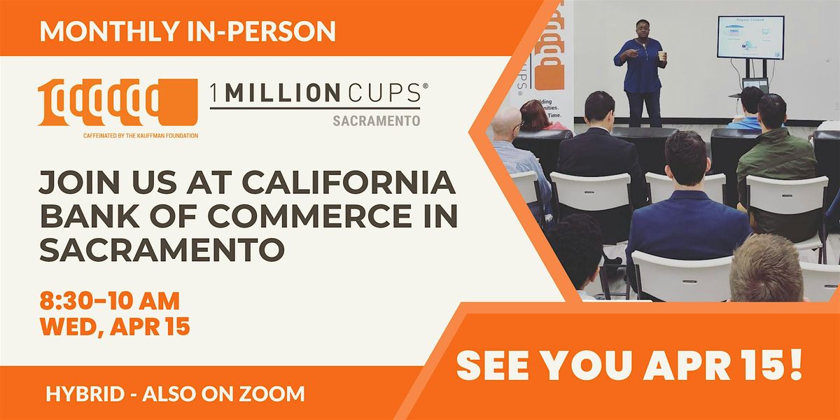 1 Million Cups Sacramento is having an in-person meetup on Wednesday, April 15, at California Bank of Commerce.