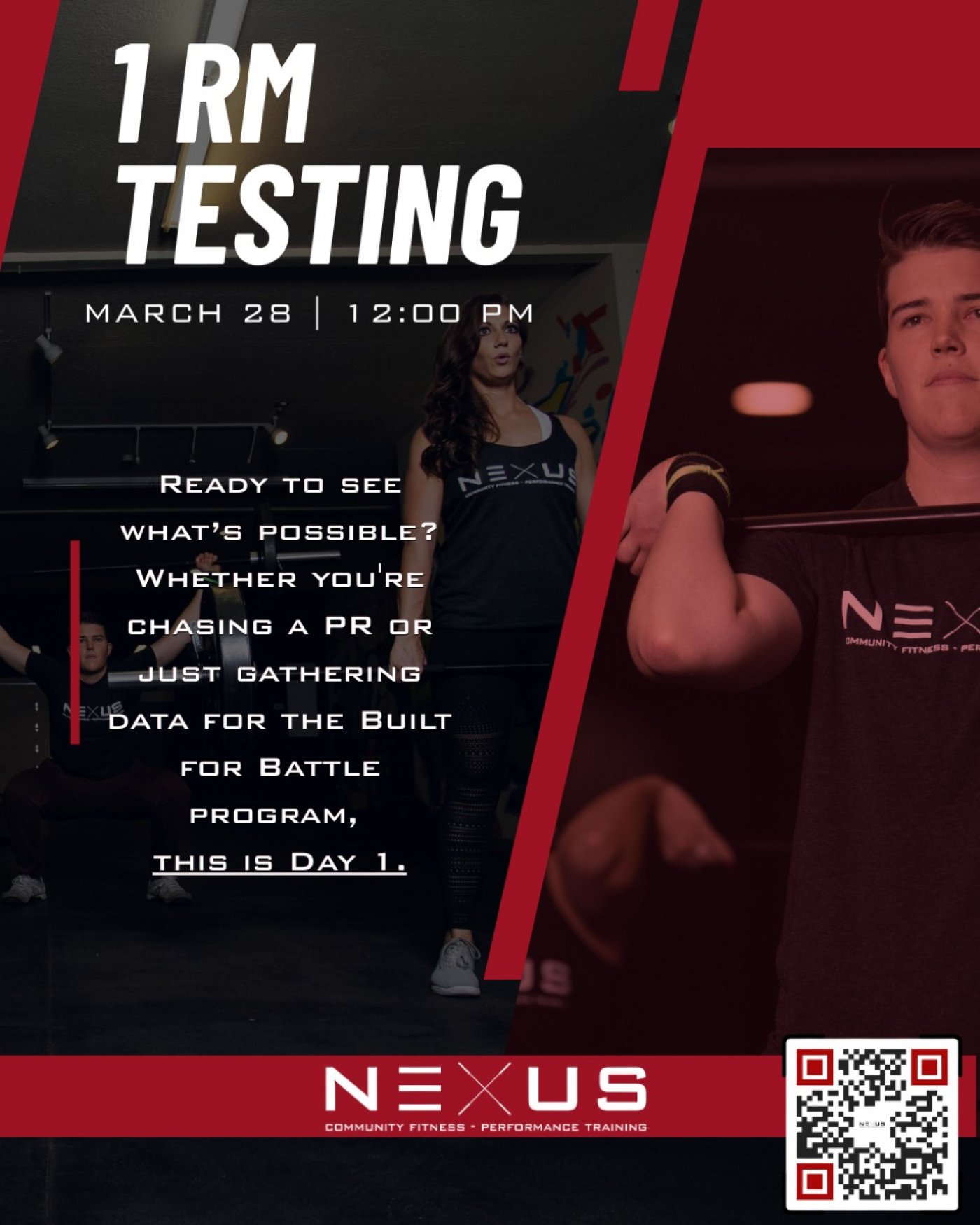 It’s time to find out what you’re made of on March 28th at 12pm! 💪 Join us for 1RM Testing Day and discover where your maxes truly stand—or use this session to dial things in as you prep for the NEXUS Competition.