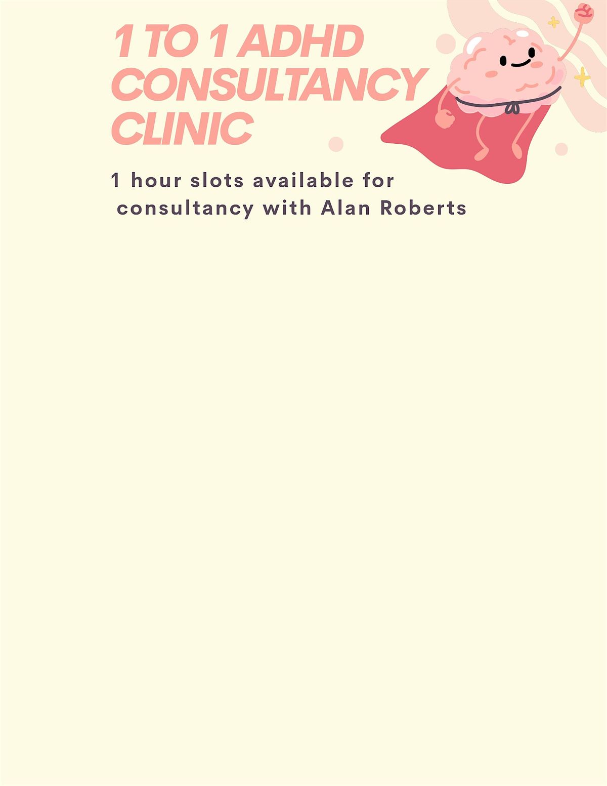 Alan who runs the ADHD courses is kindly offering 1 to 1 slots each month. If you want to have a chat then please choose and book a slot.