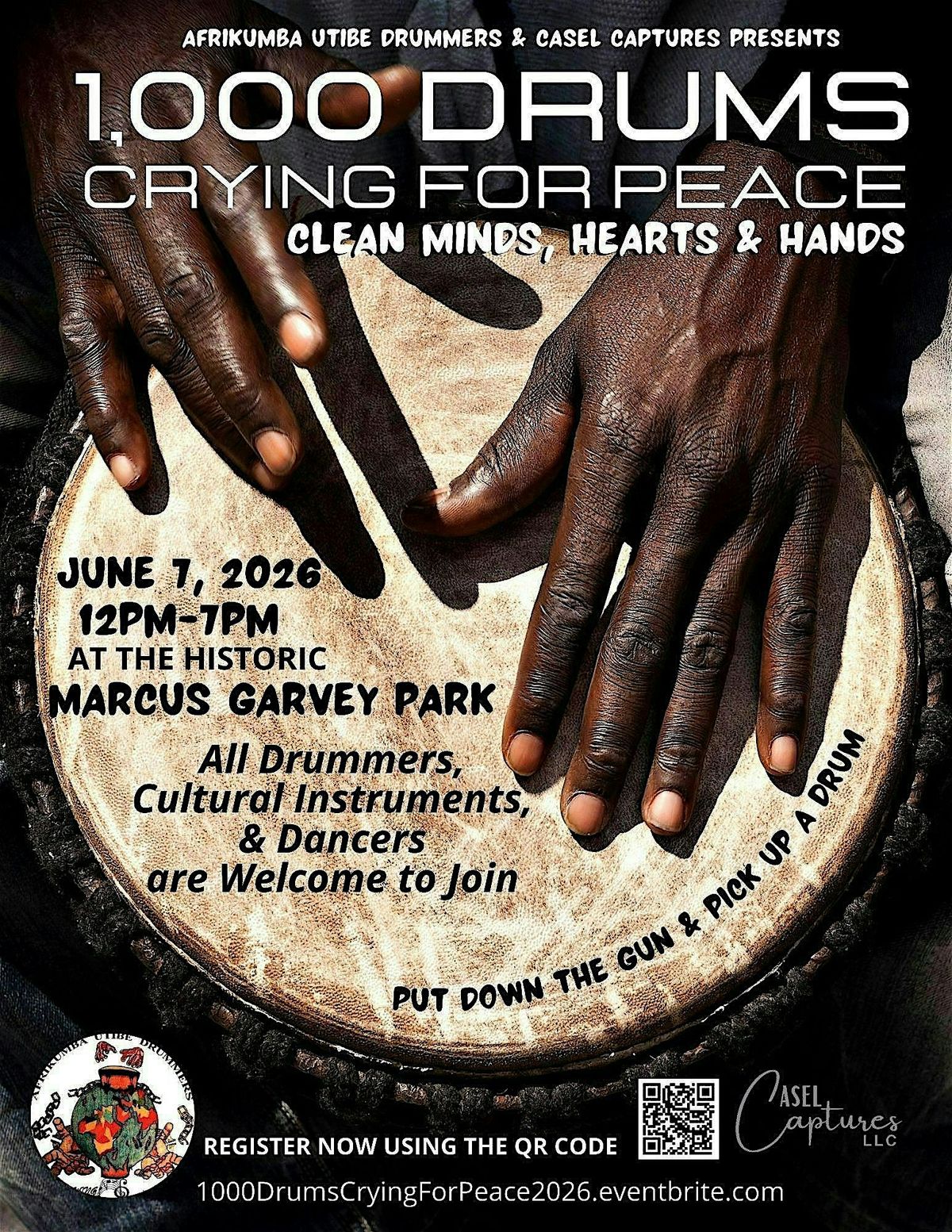 Bring family, friends &/or your drum to Marcus Garvey Park in Harlem for 1,000 DRUMS CRYING FOR PEACE