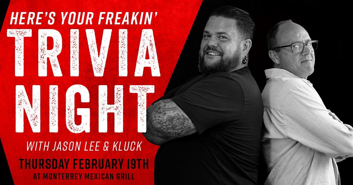 Don't miss 103.9 The Bear's - Here's Your Freakin' Trivia Night. Hosted by Jason Lee & Kluck! Happening at Monterrey Mexican Grill. Join us on February 19, 2026 6pm-8pm for a Rock 'n' Roll Trivia Night. All procedes supporting Freedom Systems and their mission to help Veterans!