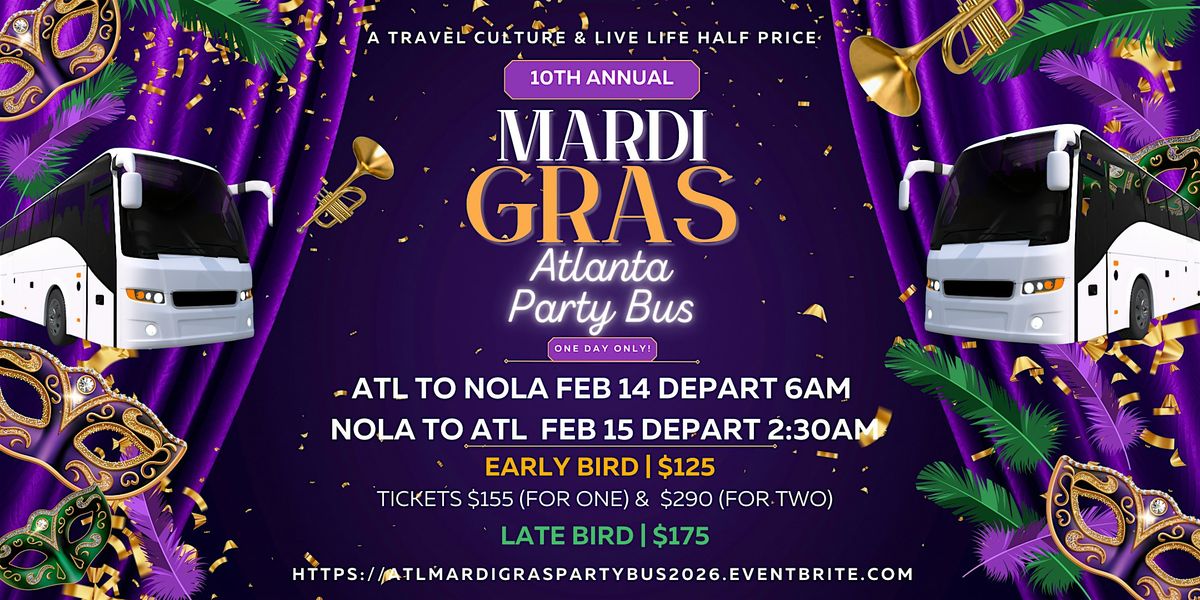 Get ready to party on the 10th Annual Atlanta Mardi Gras Party Bus in 2026 with unlimited alcohol included - it's going to be a wild ride!About this Event
