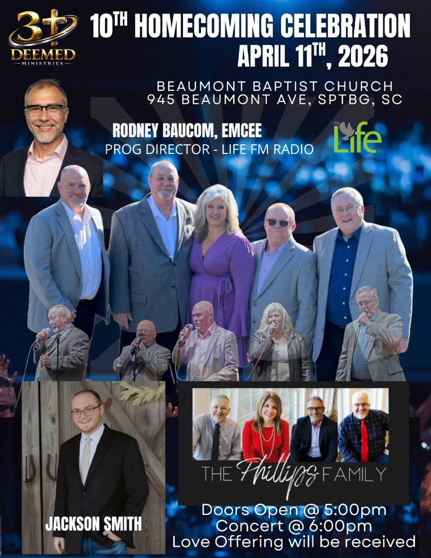 Join us at the 10th Annual Homecoming Celebration hosted by 3Deemed Ministries, featuring an unforgettable evening of music with renowned artists, Jackson Smith and The Phillips Family.