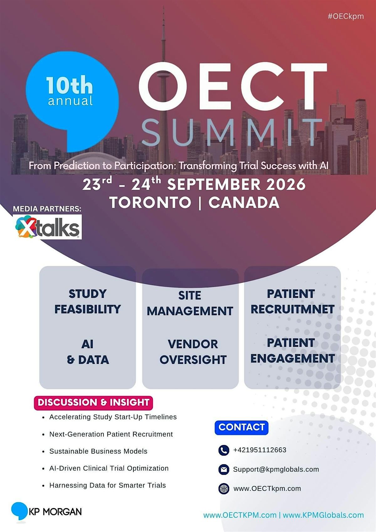 The OECT Summit Canada unites clinical research professionals who are continuously seeking innovative solutions and forward-thinking strategies to enhance performance and trial outcomes. Designed for leaders in Clinical Operations, Project Management, and Research Excellence, the summit focuses on today’s most pressing challenges — Study Feasibility, Site Management, Patient Recruitment & Retention, Outsourcing Clinical Trials, and Vendor Oversight. Each of these areas plays a critical role in optimizing timelines, budgets, collaborations, and maintaining the scientific integrity of clinical trials.