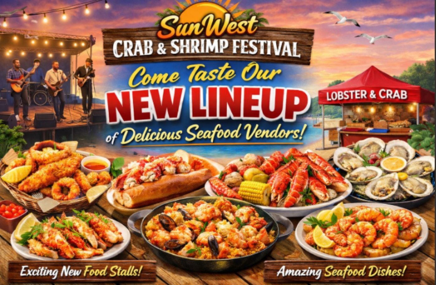 The 11th Annual SunWest Crab & Shrimp Festival Sponsored by Florida's Sports Coast will return to the beautiful sandy beaches of SunWest Park on the Feb 21st & 22nd with live bands all weekend, seafood vendors, crab races, games and tournaments, and more!