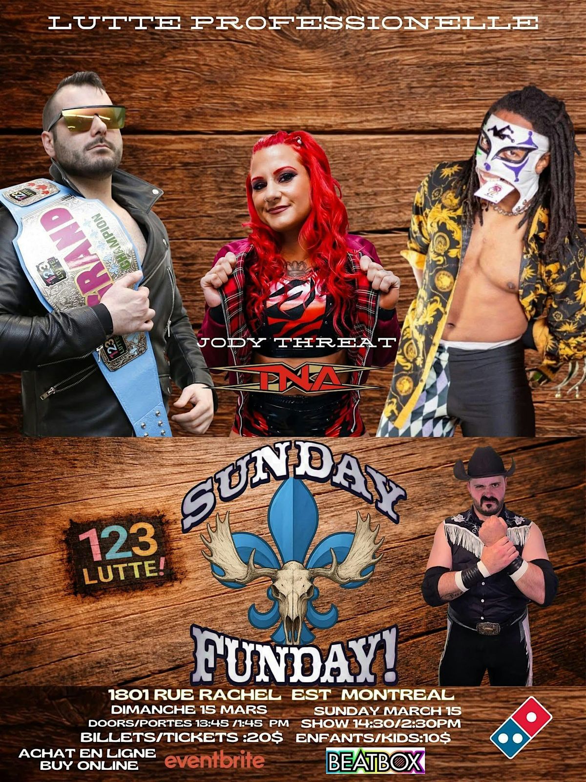 Le 15 Mars 123 Lutte! Présente une autre show de lutte avec les super étoiles comme JODY THREAT , JT PRODUCER et KEVIN BÉRU !