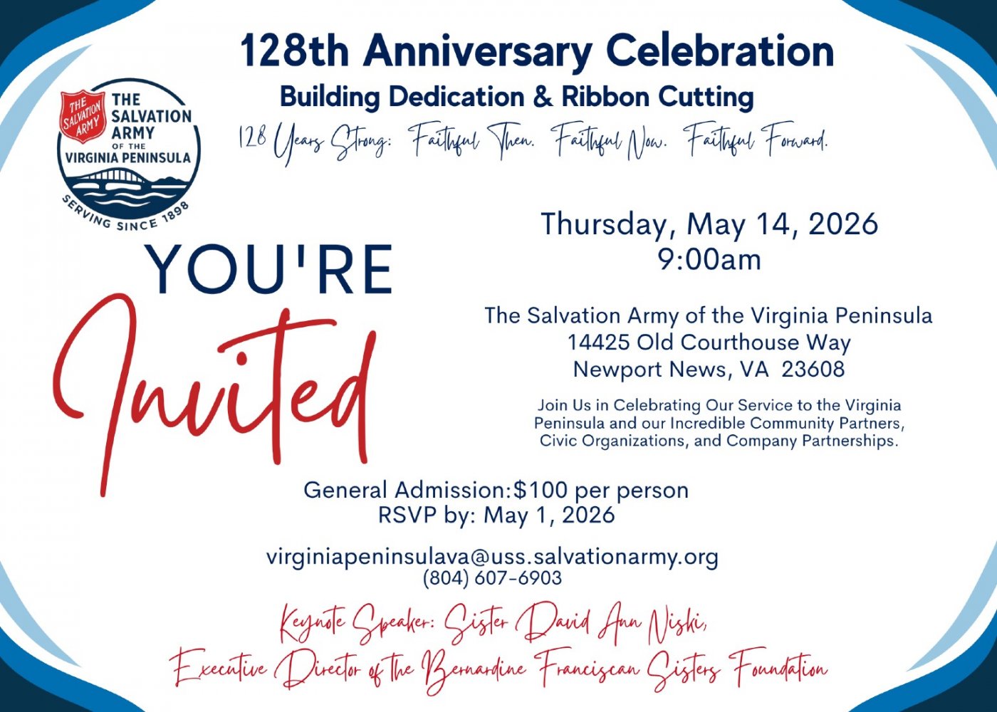 For 128 years, The Salvation Army has been a steadfast source of hope on the Virginia Peninsula — meeting human needs in His name without discrimination.