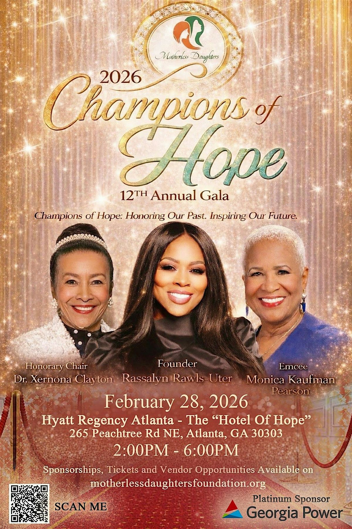 You are cordially invited to walk the red carpet and join us for an unforgettable afternoon at the 12th Annual Motherless Daughters Foundation Gala — Champions of Hope. This signature event will take place at the iconic Hyatt Regency Atlanta, located at 265 Peachtree Street in the heart of downtown Atlanta, with festivities beginning promptly at 2:00 PM.