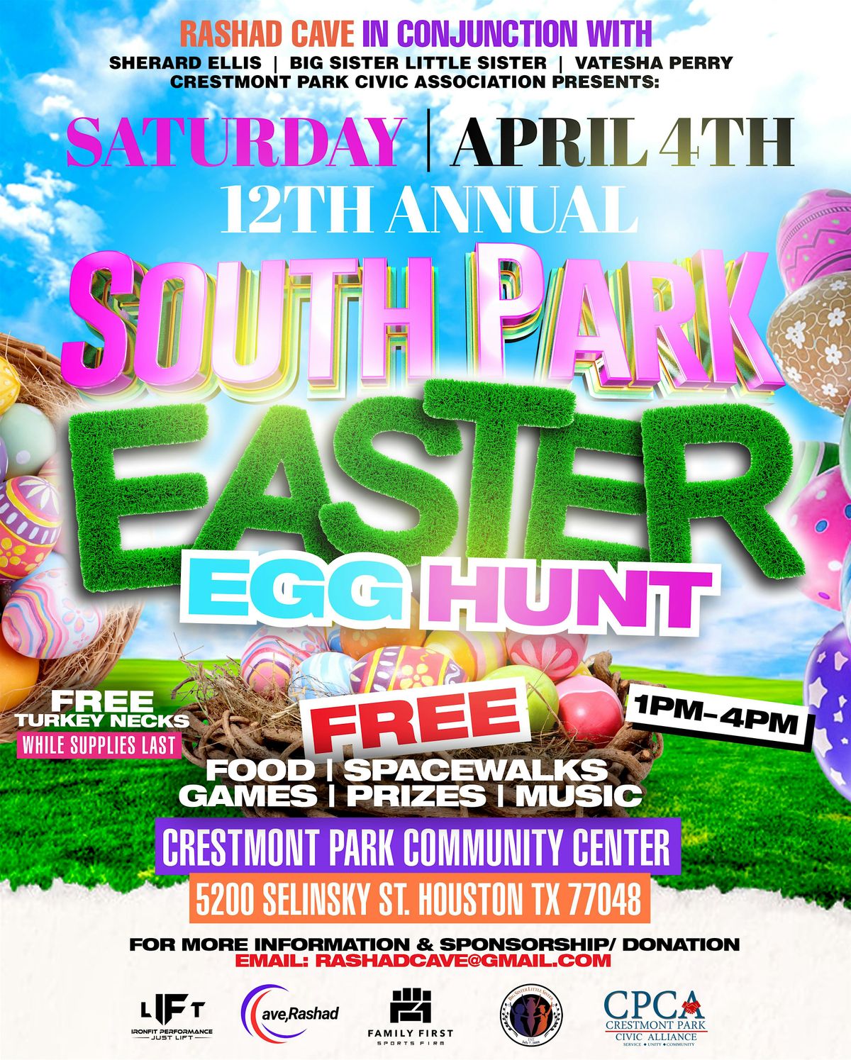 Join us for the 12th Annual Community Easter Egg Hunt—Saturday, April 4, 2026, 1:00–4:00 PM at Crestmont Park—serving 500+ children in South Park and surrounding neighborhoods with FREE food, enrichment activities, candy, and Easter baskets.