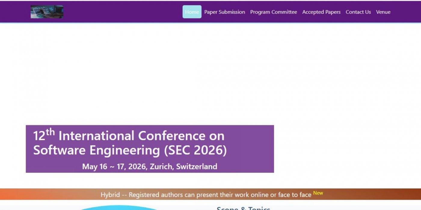 12th International Conference on Software Engineering (SEC 2026) invites high quality submissions presenting original research, innovative ideas, and practical experiences across all areas of software engineering. SEC 2026 aims to bring together researchers, practitioners, and industry leaders to advance the state of the art and practice in software engineering, with a strong emphasis on emerging technologies, rigorous methods, and impactful applications.