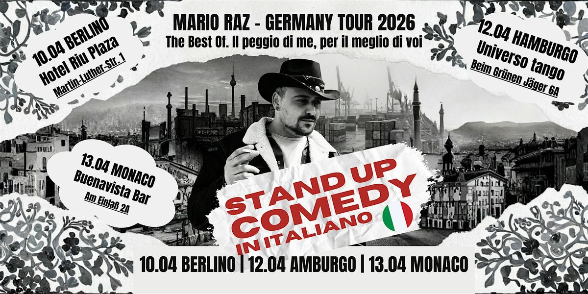 🎙️- THE BEST OF (European Tour 2026) Ex volto di Comedy Central, Mario Raz non porta souvenir dall'Italia. Porta una compilation dei suoi pezzi migliori: un concentrato di disagi, scelte sbagliate, querele ricevute e pura ironia tagliente. Niente filtri, niente burocrazia, solo un microfono, tanta verità e risate consensuali.