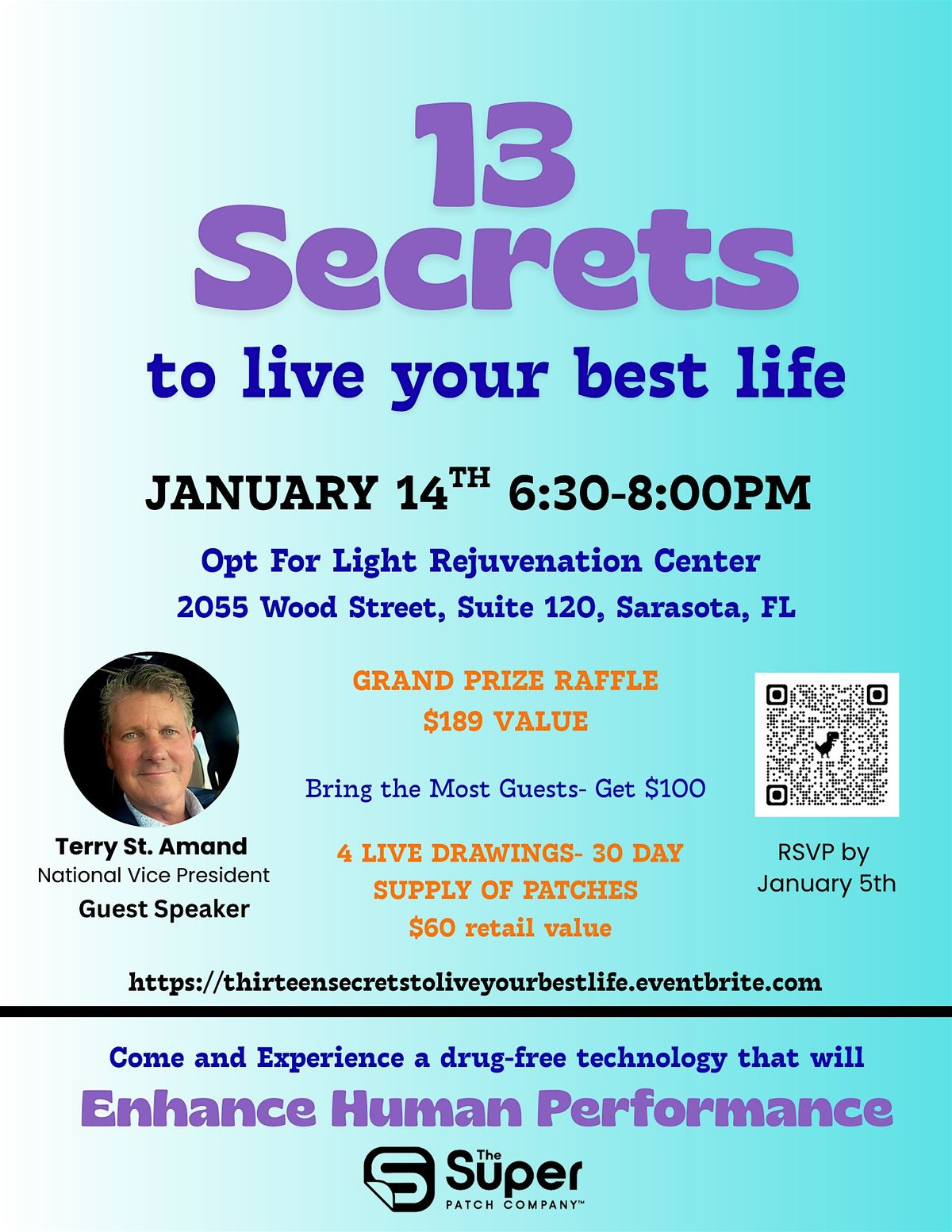 Welcome to the 13 Secrets to Live your Best Life event! Join us at Opt For Light Rejuvenation Center on January 14, 2026 at 6:30 PM (Eastern Time) for an evening of inspiration. Learn how to unlock the keys to living your best life through the mind body connection and neuro-tactile technology. Don't miss out on this opportunity to find instant balance and embrace new possibilities to enhance human performance. See you there!