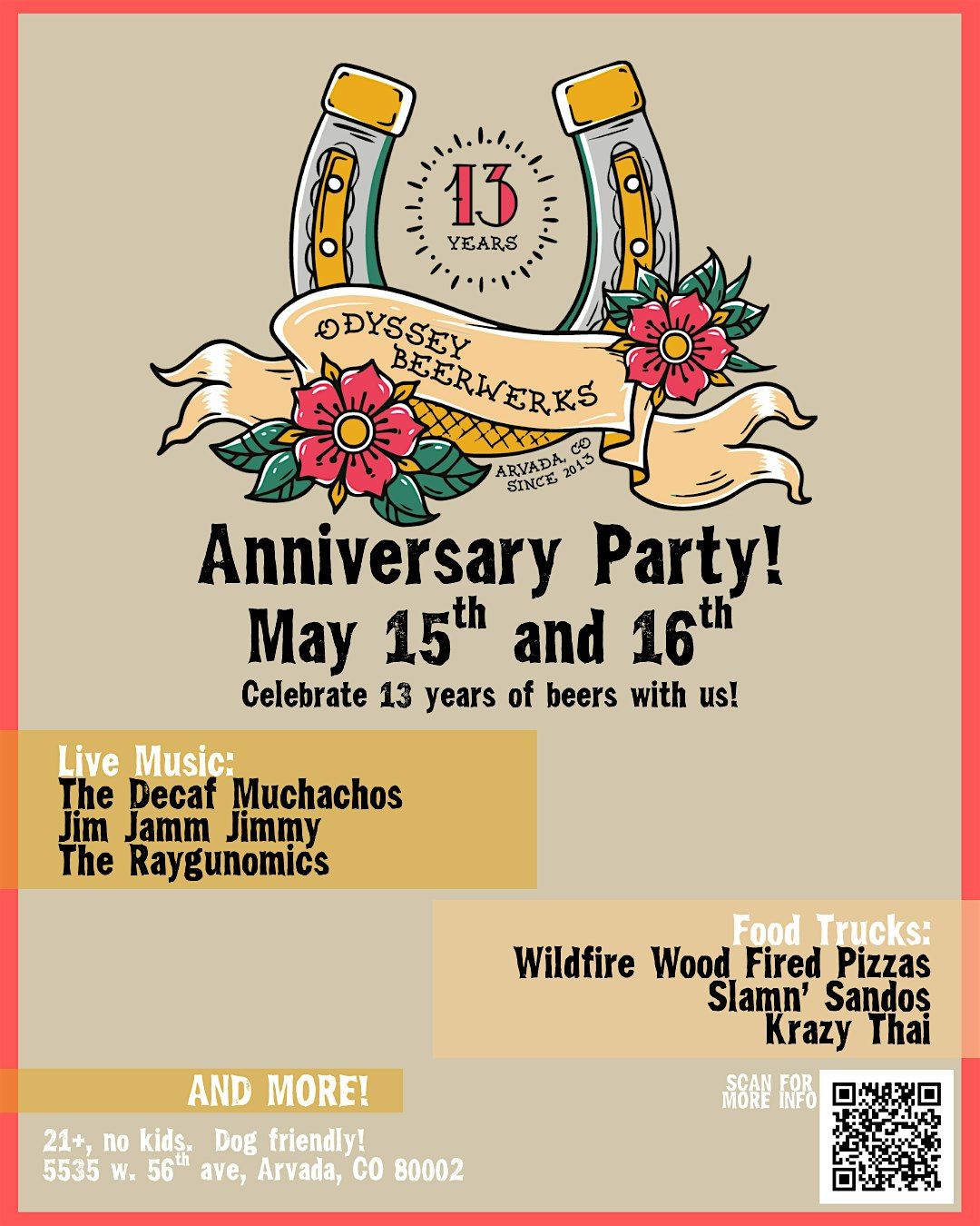 IT'S TIME TO PARTY! Join us at Odyssey Beerwerks on May 15th and 16th to celebrate 13 years of amazing beers! Live music from The Decaf Muchachos, Jim Jamm Jimmy, and the Raygunomics. Food from Krazy Thai, Slamn Sandos, and Wildfire Woodfired pizzas. Plus much more! Head to https://bit.ly/4malh94 for more info and updates.