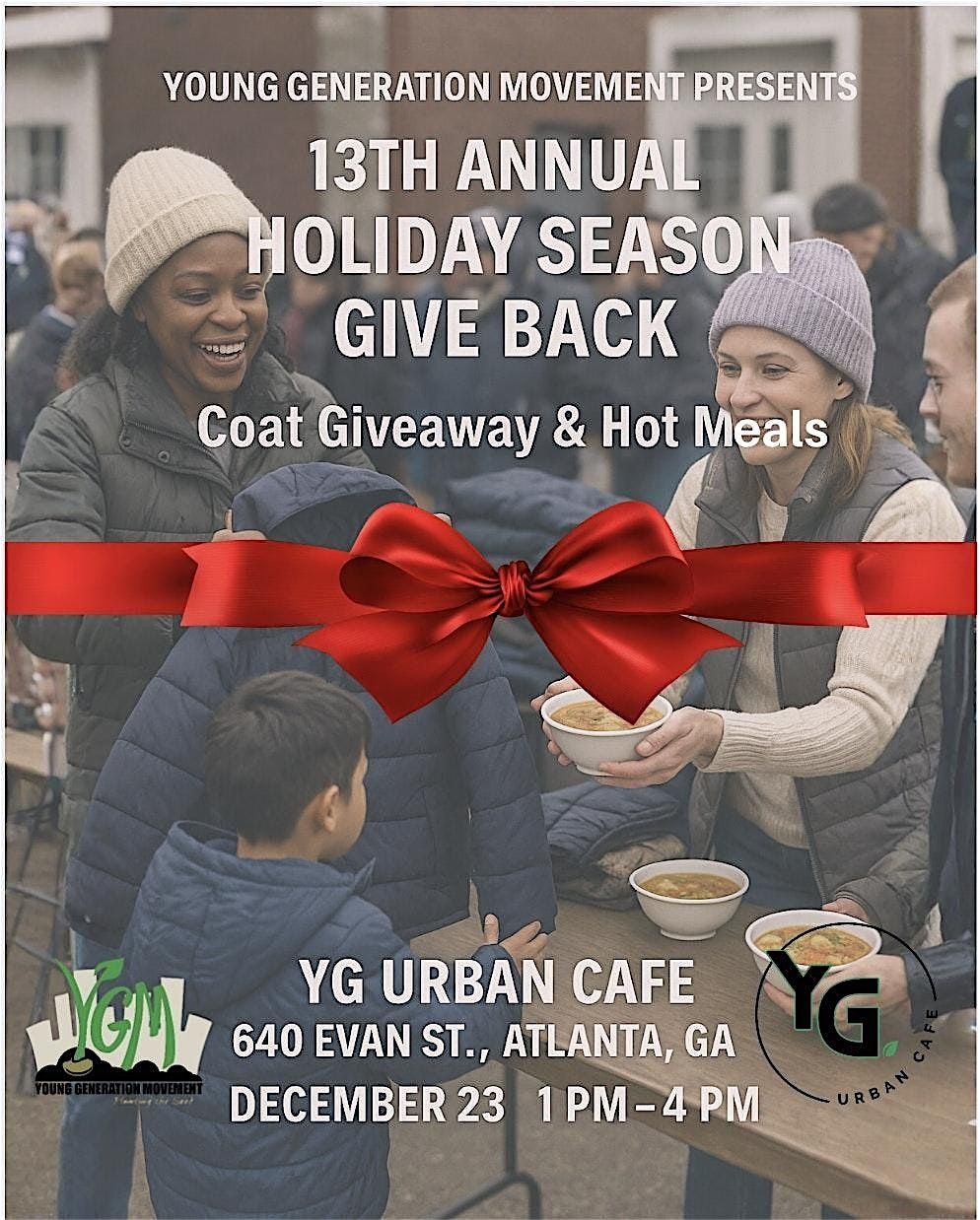 Join us for the 13th Annual Holiday Season Giveback hosted by Young Generation Movement (YGM) at our home base, YG Urban Café. This heartfelt tradition is all about serving love, meals, and coats to those in need while celebrating the spirit of unity and compassion.
