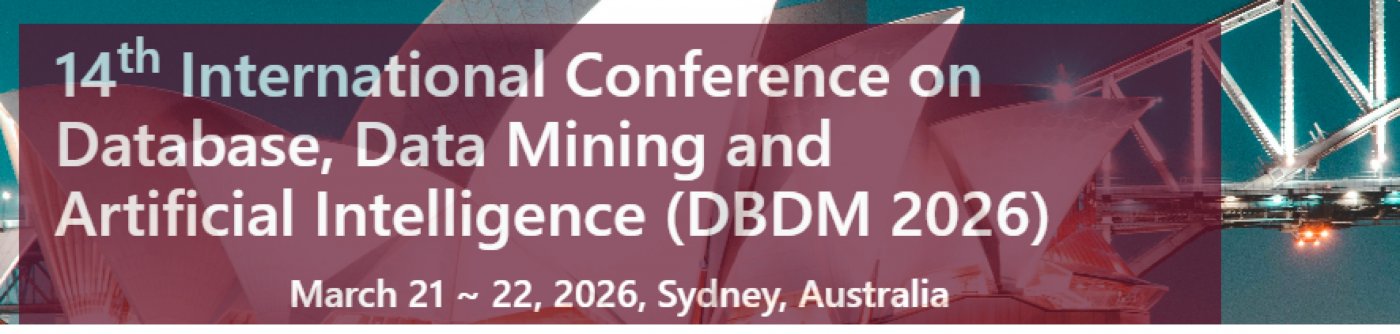 14th International Conference on Database , Data Mining and Artificial Intelligence (DBDM 2026) provides a premier forum for researchers, practitioners, and industry experts to present and discuss the latest innovations, trends, results, and challenges across databases, data mining, and AI driven intelligent systems. The conference aims to foster collaboration and knowledge exchange through high quality, peer reviewed research contributions.
