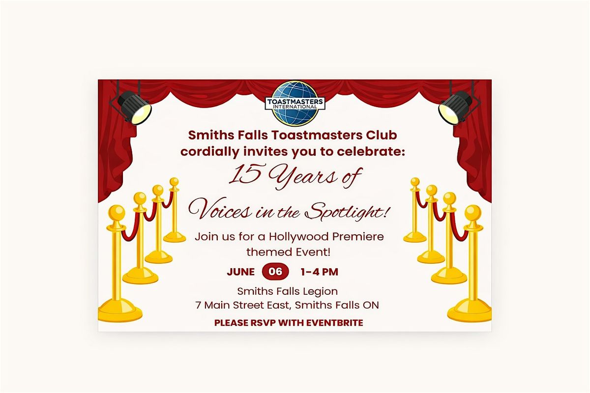Join the Smiths Falls Toastmasters Club as we celebrate 15 Years of Voices in the Spotlight! This special anniversary event will be held on June 6 from 1–4 PM at the Smiths Falls Legion, 7 Main Street East, Smiths Falls, ON.