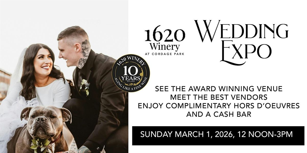 Join us for our NINTH Annual Wedding Expo! This free event is for anyone planning a wedding! Come view our rustic, winery venue, meet local vendors, dance to the live DJ, enjoy delicious hors d'oeuvres prepared by 1620's Executive Chef & enjoy a cash bar. Admission is free, we just ask you please register at eventbrite.com so we can keep track for food purposes.
