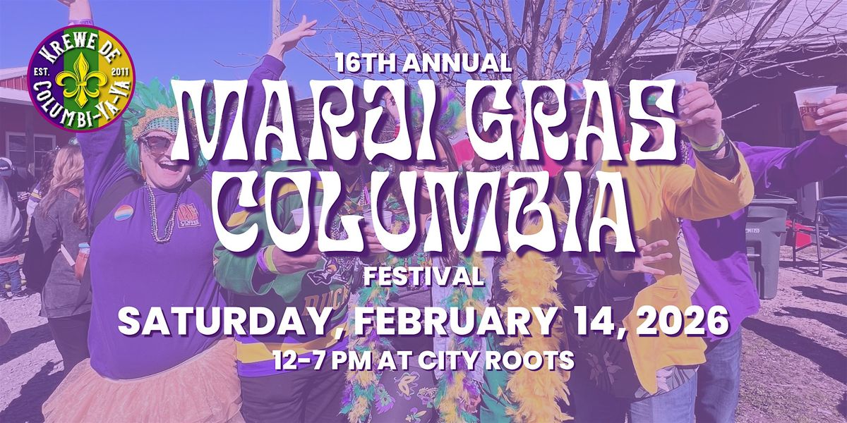 Mark your calendar — the 16th Annual Mardi Gras Columbia Parade & Festival is going down at City Roots urban farm on Saturday, February 14, 2026 in Columbia, SC! ⚜️