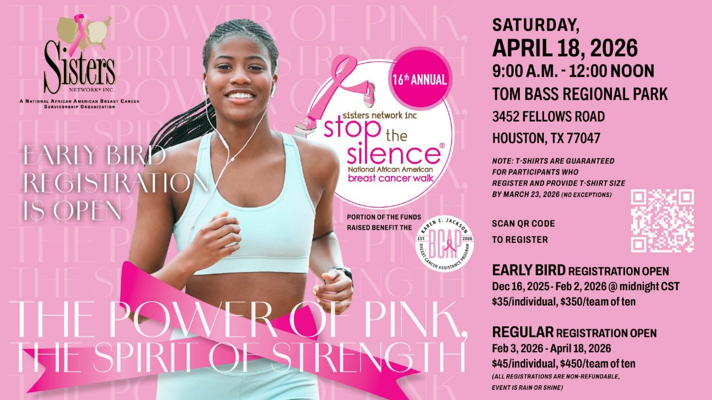 Sisters Network® Inc. (SNI), the nation's leading voice for Black breast cancer survivors is proud to announce the 16th Annual Stop the Silence® National African American Breast Cancer 5K Walk/Run. This year's theme; "The Power of Pink, The Spirit of Strength." The highly anticipated 5K Walk/Run will be hosted in Houston, TX., on Saturday, April 18, 2026, at Tom Bass Regional Park, 3452 Fellows Rd., from 9:00 A.M. to 12:00 P.M. A portion of the funds raised from the walk support the Karen E. Jackson Breast Cancer Assistance Program (BCAP).