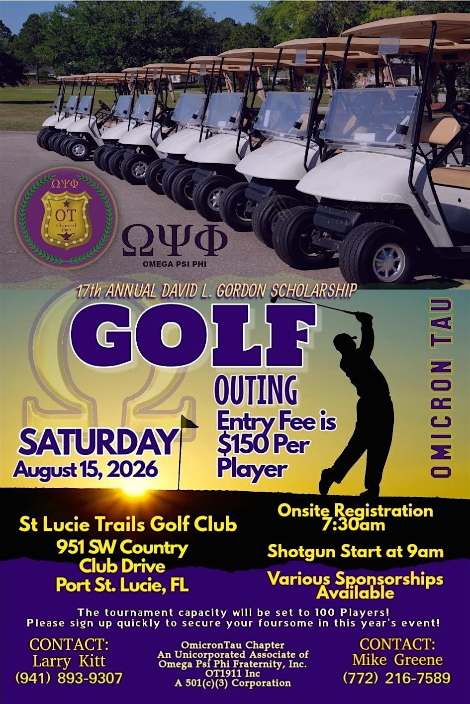 This golf outing is sponsored by Omicron Tau Chapter of Omega Psi Phi Fraternity, Inc. in partnership with O.T. 1911,Inc., a 501 (c) 3 corporation (Tax ID # 271038641). Omicron Tau is the graduate chapter for the Indian River, Martin, Saint Lucie and Okeechobee Counties and the members are local doctors, educators, administrators and business owners. This chapter sponsors a Golf Event to fund scholarships for college bound high school seniors and also to support mentoring activities for younger students. This year the event will be held at the St Lucie Trails Golf Club in Port St Lucie, FL on Saturday, August 16, 2025. 9:00 am Shot Gun Start.