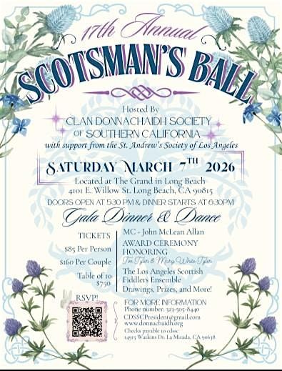 Get ready for a night of fun at the Grand On Willow in Long Beach, CA! This in-person event brings together great vibes, amazing people, and unforgettable memories. Whether you're a local or just visiting, don't miss out on the 17th Annual Scotman's Ball—a celebration you’ll want to be part of every year!