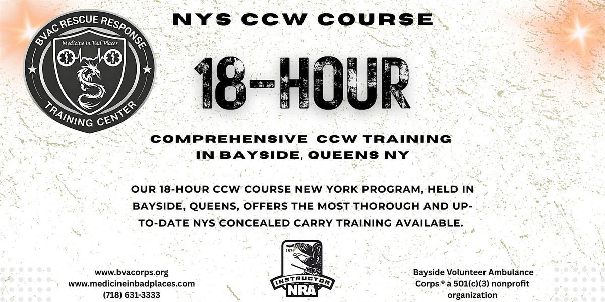 - Where to take 18-hour CCW in Queens: Classes are hosted at BVAC Rescue Response Training Center, easily accessible by public transit and major roadways.