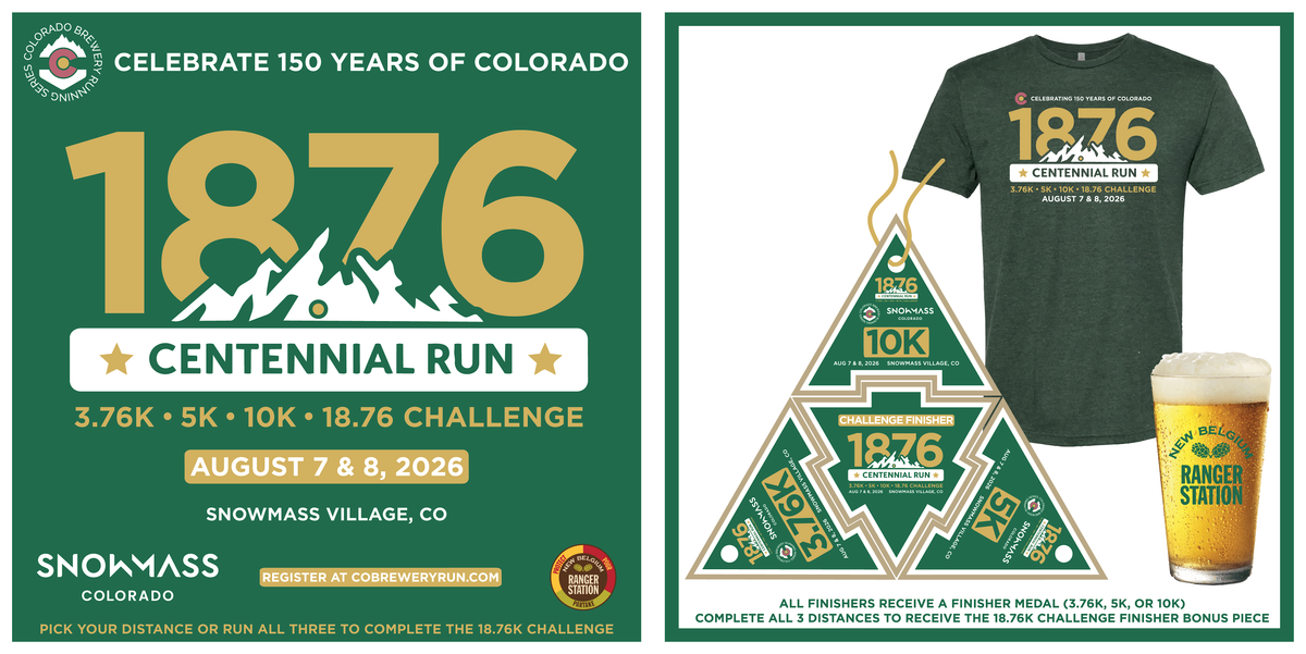 In honor of the State of Colorado's 150th Birthday this August, join us for the 1876 Centennial Run (3.76k + 5k + 10k + 18.76k Challenge) on August 7 & 8, 2026. In partnership with the town of Snowmass and the New Belgium Ranger Station, this unique event will feature a 3.76k, 5k, and 10k run/hike. The 3.76k and 5k can be run on Friday night or on Saturday morning. The 10k will only take place one time on Saturday morning at 7:30am. Run one, two, or all 3 distances in order to complete the 18.76k Challenge! Run, walk, jog, hike - whatever goes! Complete the course and celebrate with us and a FREE, New Belgium brew at the finish line.