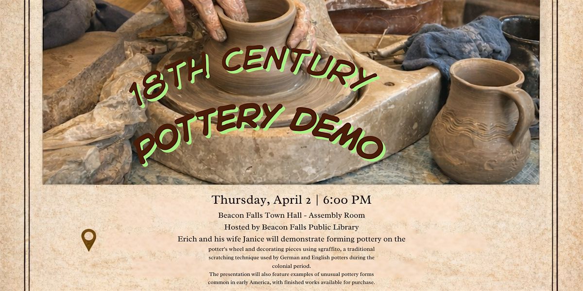 Step back in time with a live 18th-century pottery demonstration by Erich and Janice Steinhagen of Steinhagen Pottery in Griswold, Connecticut. They will demonstrate traditional pottery techniques used during the colonial period, including forming pottery on the wheel and decorating pieces using sgraffito, a historic scratching method used by German and English potters. The program will also highlight unusual pottery forms found in early America. Attendees will have the opportunity to view finished pieces and learn about historic pottery traditions.