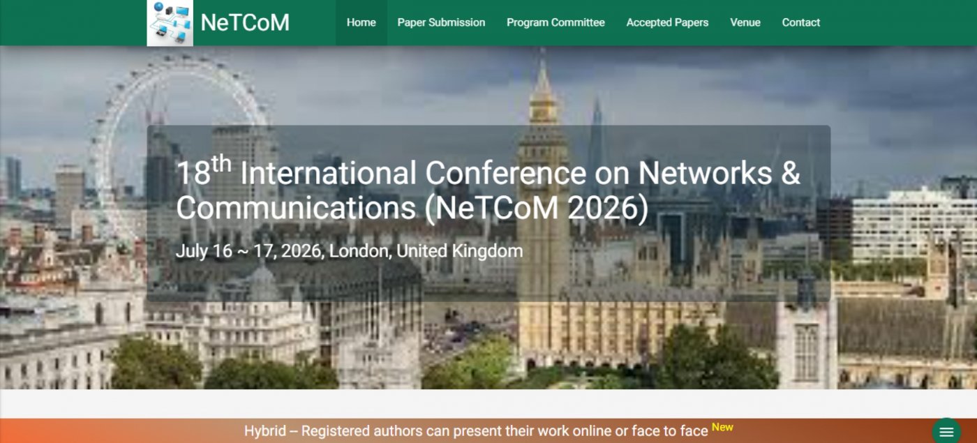 18th International Conference on Networks & Communications (NeTCoM 2026) will provide an excellent international forum for sharing knowledge and results in theory, methodology and applications of Computer Networks & Data Communications. The Conference looks for significant contributions to the Computer Networks & Communications for wired and wireless networks in theoretical and practical aspects. Original papers are invited on Computer Networks, Network Protocols and Wireless Networks, Data Communication Technologies, and Network Security. The aim of the conference is to provide a platform to the researchers and practitioners from both academia as well as industry to meet and share cutting-edge development in the field.