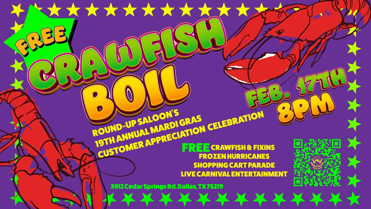 Welcome to the 19th Annual Mardi Gras Customer Appreciation Celebration at Round-Up Saloon! Get ready to party with us on Tue, Feb 17, 2026 starting at 8:00 PM. Let's celebrate YOU, our amazing customers, with a night of music, dancing, and fun. Wear your best Mardi Gras attire and get ready to let loose! Join us for a night you won't forget at Round-Up Saloon. Enjoy our FREE crawfish boil, sides, and king cakes for everyone to eat! We'll have our take on a Mardi Gras parade, and Carnival drag show and entertainment.