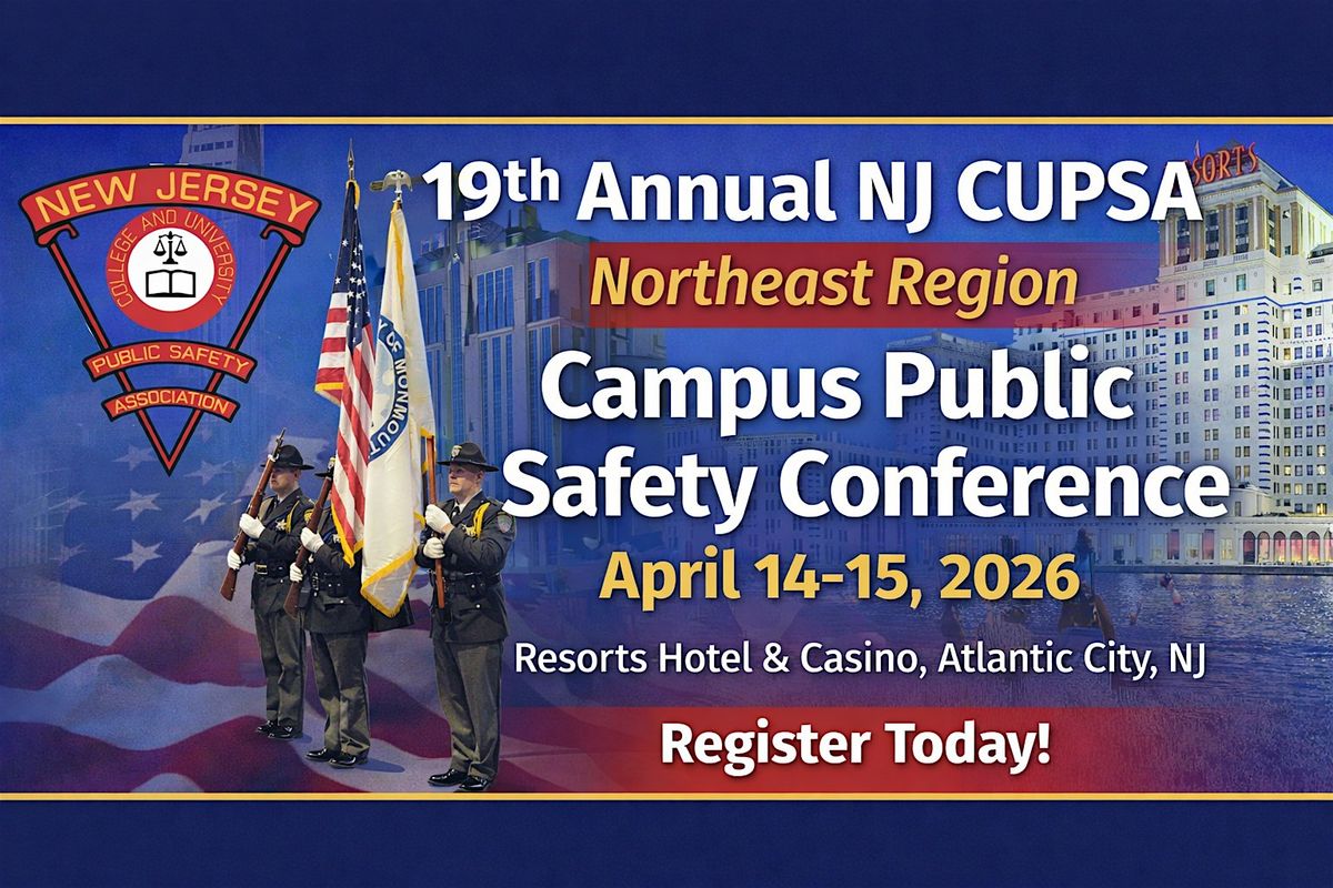 Welcome to the 19th Annual NJ CUPSA Northeast Region Campus Public Safety Conference! Join us in person at the Resorts Hotel & Casino in Atlantic City, N.J April 14-15, 2026 for informative sessions, networking opportunities, and engaging discussions. This premier event brings together public safety professionals from across the region for two plus days of in-depth training sessions, hands-on vendor demonstrations, insightful exhibits, expert instruction, professional development, complementary receptions and hospitality suites courtesy of corporate sponsors dedicated to ensuring the highest caliber materials and services available for our Campus partners. Attendees will gain valuable knowledge and actionable strategies on cutting-edge issues of utmost importance to the profession and constituents we serve. Don't miss out! Register now to secure your spot!