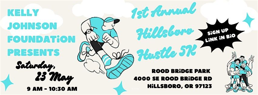 The Kelly Johnson Foundation is hosting its 1st Annual Hillsboro Hustle 5K on Saturday, May 23rd, 2026 at 9:00am PST at Rood Bridge Park (4000 SE Rood Bridge Rd, Hillsboro, OR 97123).