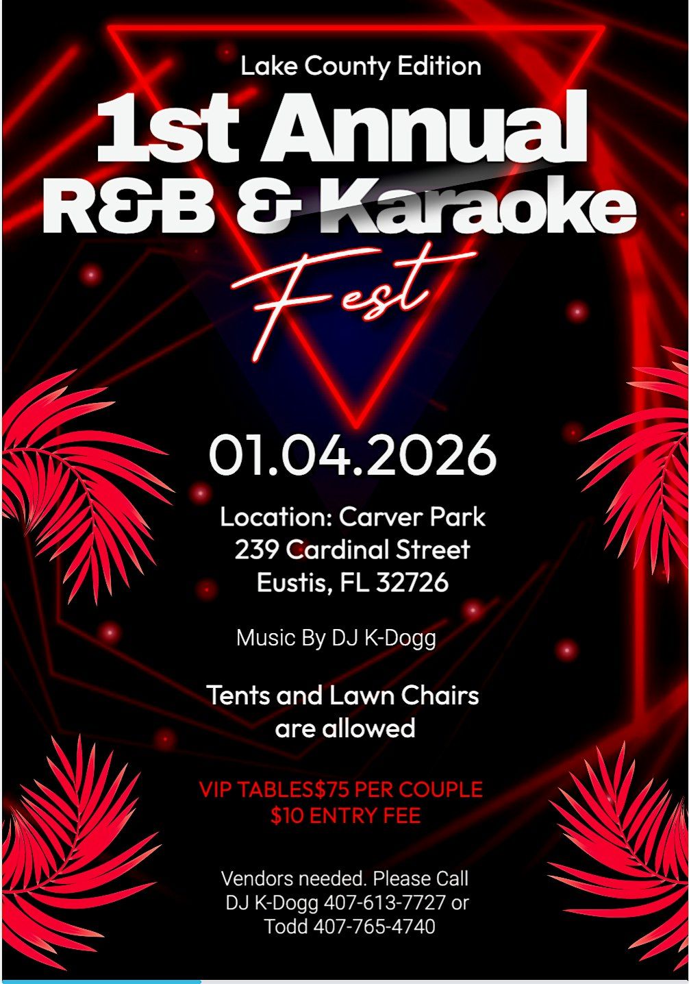 It's going to be the 1st annual Lake County R&B fest . There will be food and drinks vendors on the premises with DJ K-Dogg playing the best in R&B / Hip Hop and Old Skool music . So come out and enjoy the beautiful sites of Eustis Florida