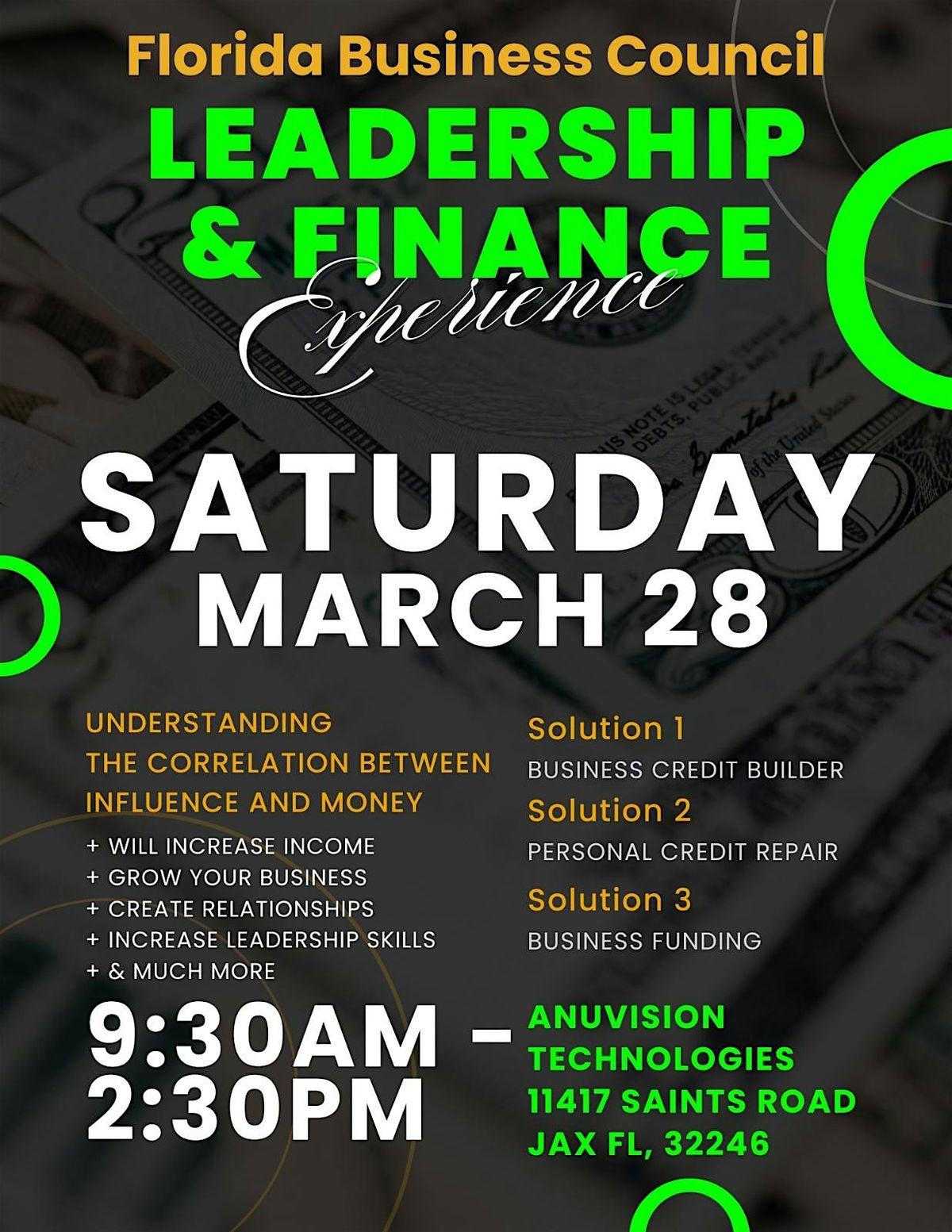 Join the Florida Business Council for an exciting in-person event at the AnuVision Technologies 11417 Saints Rd, Jacksonville, FL 32246 where top industry leaders will share their insights on leadership and finance.