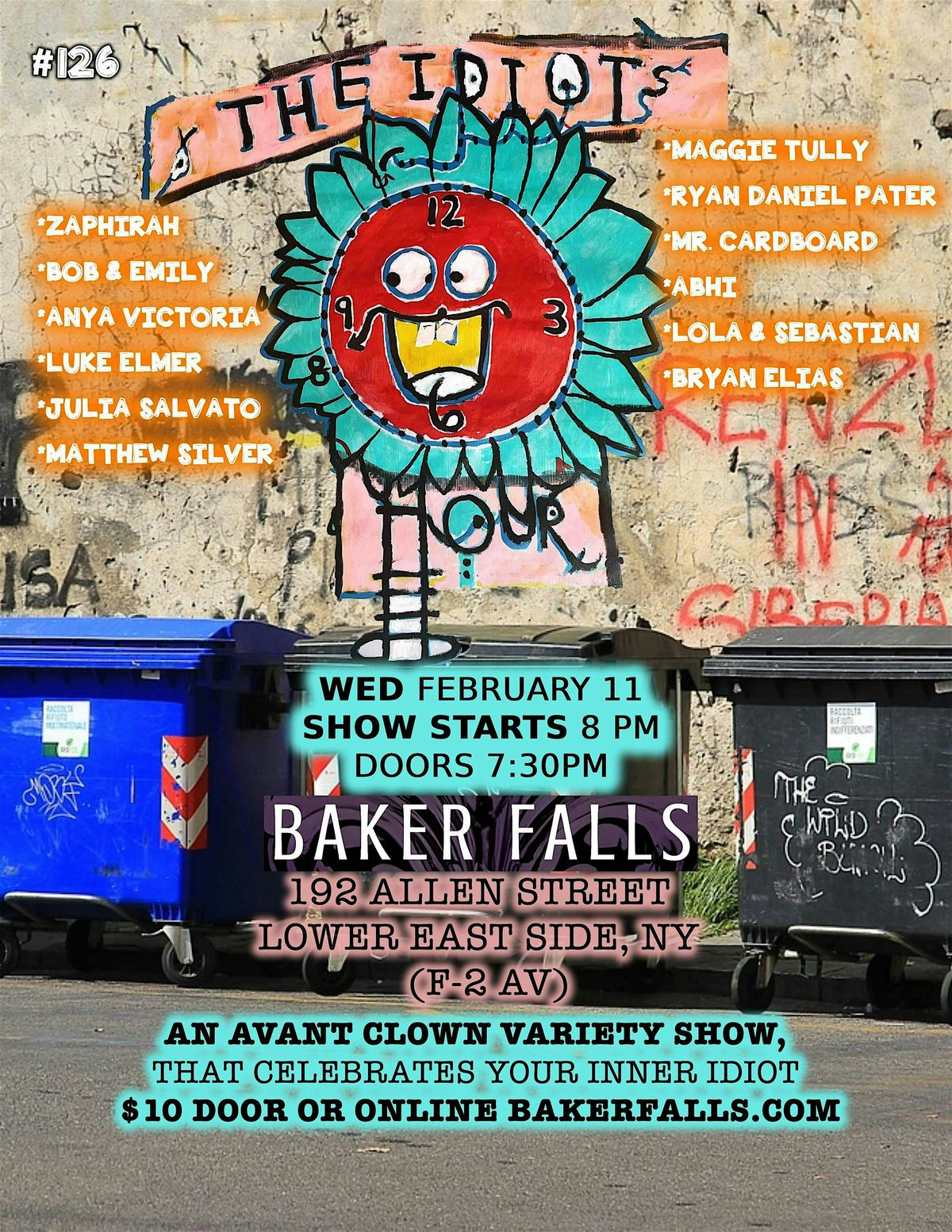 A two-hour Avant-Clown variety show celebrating your Inner Idiot! Featuring 10–12 clown performances—with a 15 min. intermission. Happening at Baker Falls in the Lower East Side.