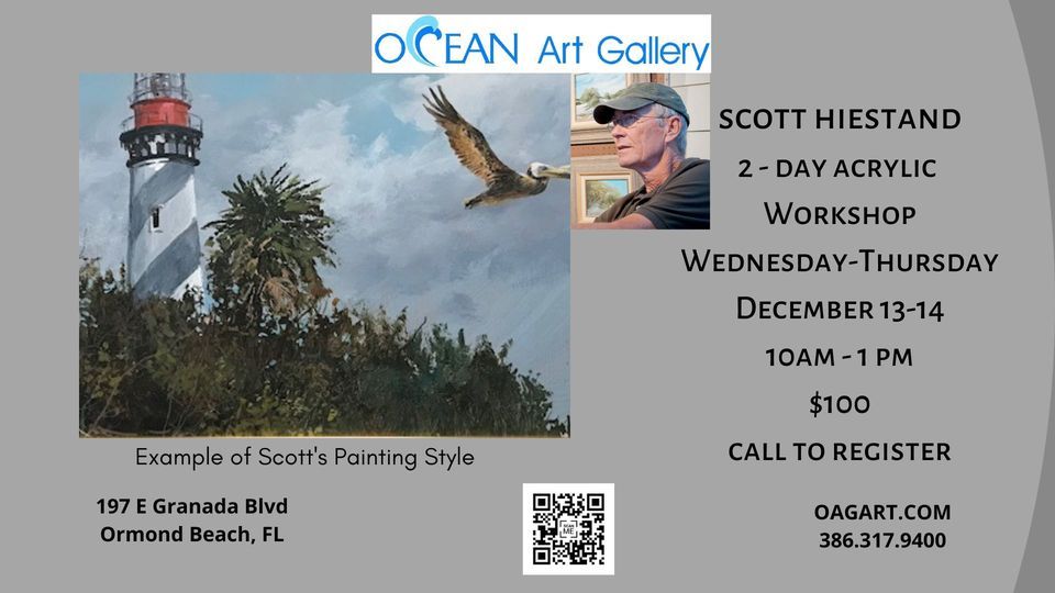 Paint along with Scott Hiestand in this 2 day Acrylic workshop or paint your own. Class fee is $100. Bring your own supplies or we can provide them for an additional $20. Call us to reserve your seat at 386.317.9400.