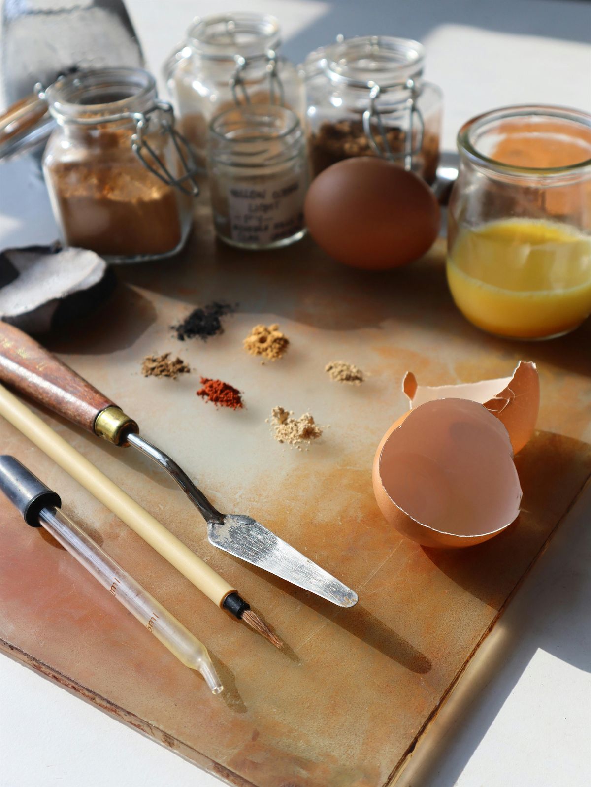 Day Two takes place in Júlia’s private art studio in Downtown Los Angeles (exact address and access details shared after registration). We’ll begin by organizing and preparing the pigments processed on Day One, covering best practices for drying, storing, labeling, and documenting handmade pigments for future use. From there, participants will learn how to make egg tempera paint using egg yolk, one of the oldest and most archival binders in painting history, while also transforming eggshells into a natural white pigment, completing the cycle from raw material to paint.