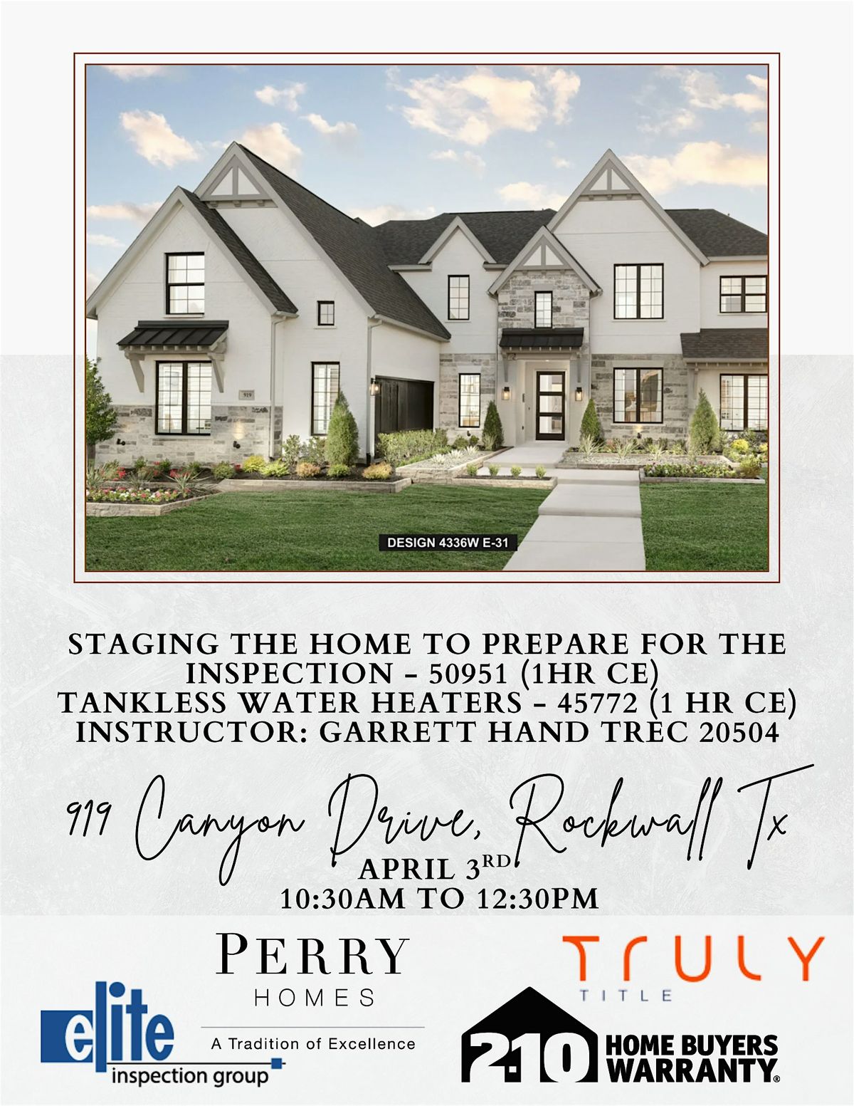 STAGING THE HOME TO PREPARE FOR THE INSPECTION - 50951 (1HR CE)TANKLESS WATER HEATERS - 45772 (1 HR CE) INSTRUCTOR: GARRETT HAND TREC 20504
