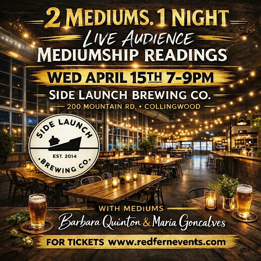 Join us on Wednesday, April 15th at Side Launch Brewery in Collingwood for a captivating evening with renowned mediums Barbara Quinton and Maria Goncalves. Doors open at 6 PM, giving you a chance to enjoy our locally brewed craft beers before the event begins at 7 PM. Experience the unique opportunity to receive medium readings live, as Maria and Barbara share their profound insights in an intimate setting. Reserve your spot now and be part of an unforgettable evening!