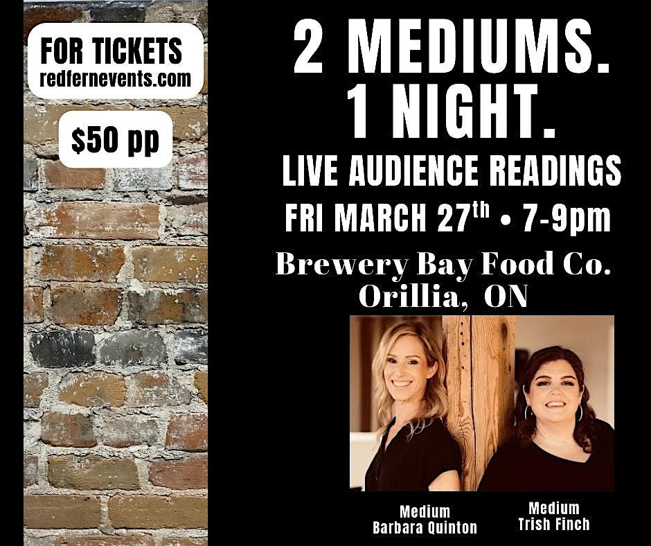 Join local Mediums Barbara Quinton and Trish Finch for an intimate evening of LIVE AUDIENCE MEDIUMSHIP READINGS at Brewery Bay Food Co. (162 Mississaga St E) ORILLIA, Friday March 27th from 7:30-9:30pm.