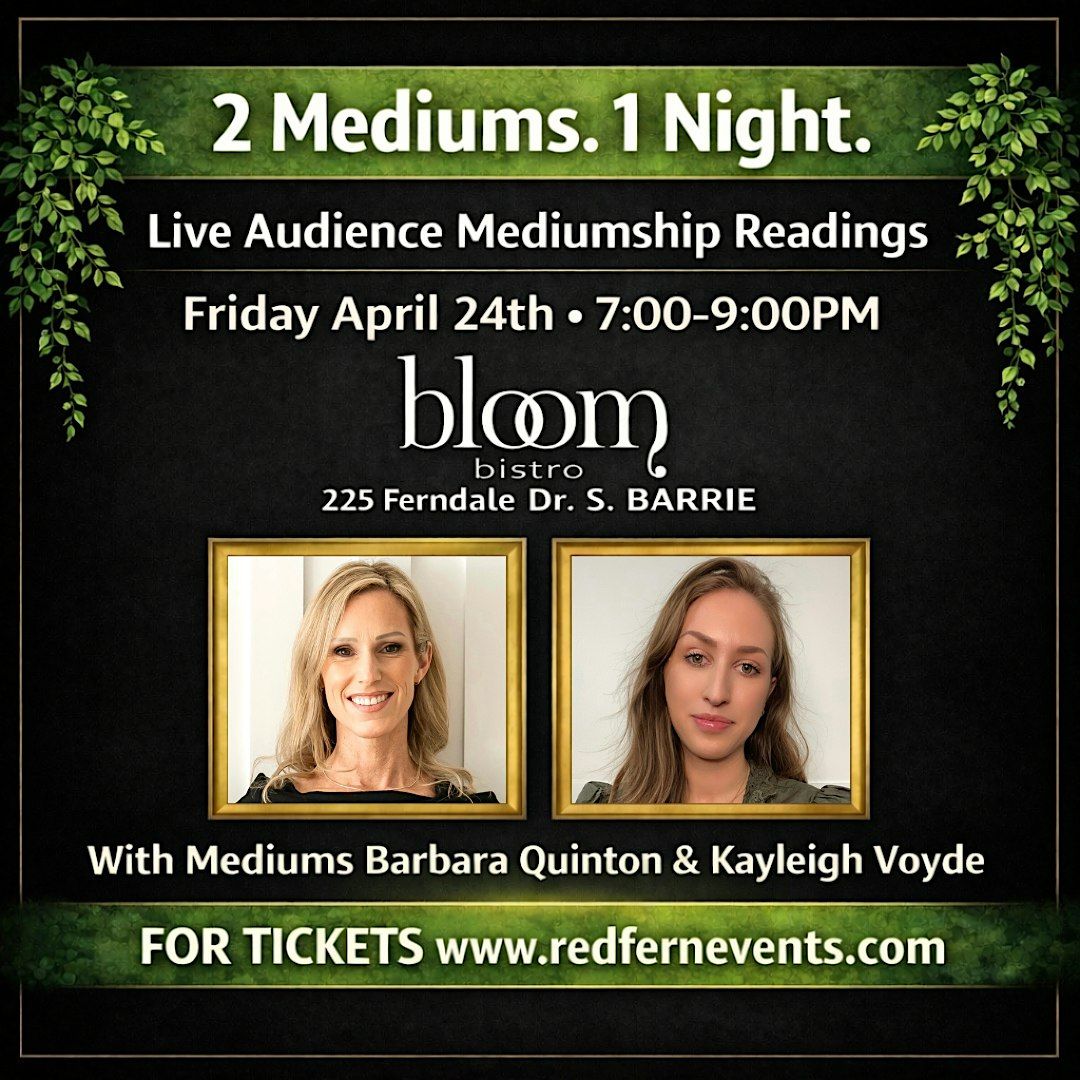 Join Mediums Barbara Quinton and Kayleigh Voyde for an intimate evening of live audience mediumship readings at BLOOM Bistro (225 Ferndale Dr S, Barrie) on Friday April 24th from 7-9pm.