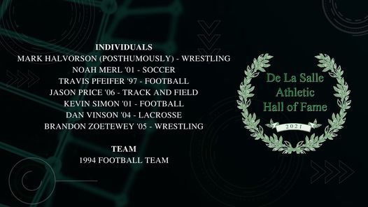De La Salle High School will induct its Athletics Hall of Fame Class of 2021 on Sunday, October 24 at 3 p.m. The 2021 Athletics Hall of Fame inductees include individuals Mark Halvorson (former varsity wrestling coach), Noah Merl ‘01 (soccer), Travis Pfeifer ‘97 (football), Jason Price ‘06 (track and field), Kevin Simon ‘01 (football), Dan Vinson ‘04 (lacrosse), Brandon Zoetewey ‘05 (wrestling), and the 1994 De La Salle Football Team.