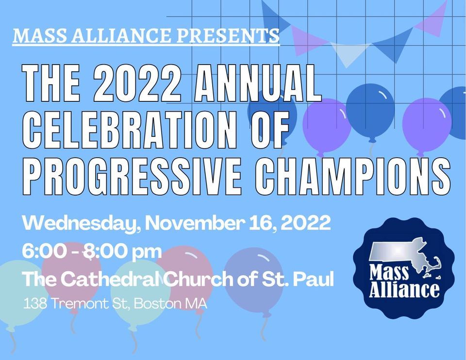 We are so excited to officially announce our upcoming 2022 Celebration of Progressive Champions on Wednesday, November 16, 6:00-8:00pm, at the St Paul Cathedral of Boston, across from the Park St T Stop and on Zoom.Join us after the election for a night of community, connection, and celebration as we wrap up 2022!! We are so excited to gather together our progressive movement to honor and celebrate our activists, candidates, and elected officials, build community, and strategize together after this important year of elections.