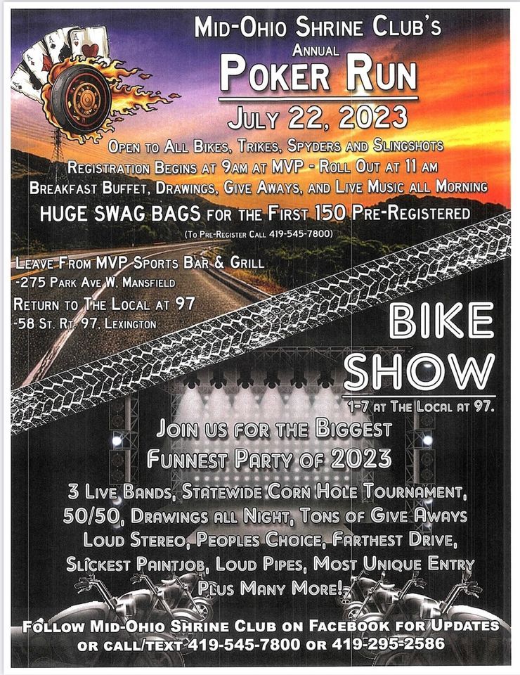 The 2023 Shriner Poker Run will be leaving from MVP Sports bar. Breakfast Buffett beginning at 8:00am, Registration 8:30am, and Bikes Leaving at 10:00. Early Registrations are going on now. The first 150 Pre-Registrations will receive a HUGE Swag bag filled with Hats, shirts, koozies, key chains, sun glasses, lanyards Ect…..