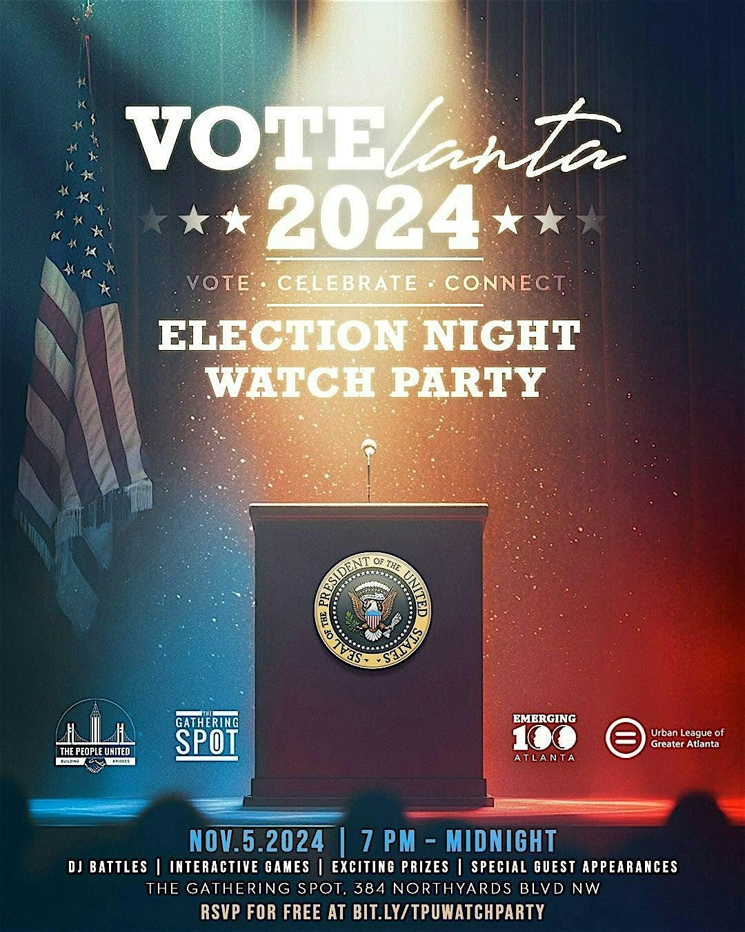 This is not your traditional election watch party vibe! We’re bringing together young professionals, college students, and community members for a vibrant celebration that energizes our democracy. Enjoy happy hour with delicious food and drinks, live entertainment that will keep the energy high, and special guest surprises throughout the night. From DJ battles that will keep you on your feet to interactive games and challenges, Votelanta is designed to make voting fun and engaging. Come ready to participate, connect with others, and enjoy the electrifying atmosphere!