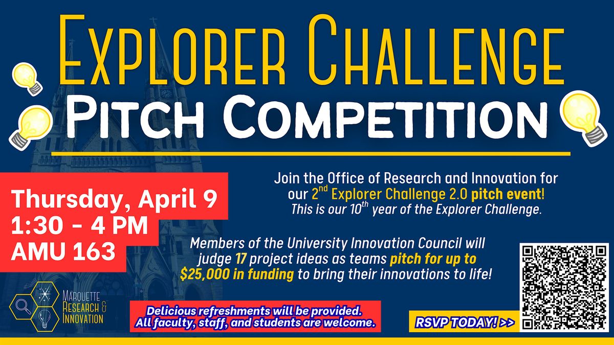 The pitch competition is open for all Marquette staff, faculty, and students to attend. 17 proposed projects will have 5 minutes to pitch their innovation idea to Innovation Council members / judges. Refreshments will be available! The event will take place in the AMU, Room 163.
