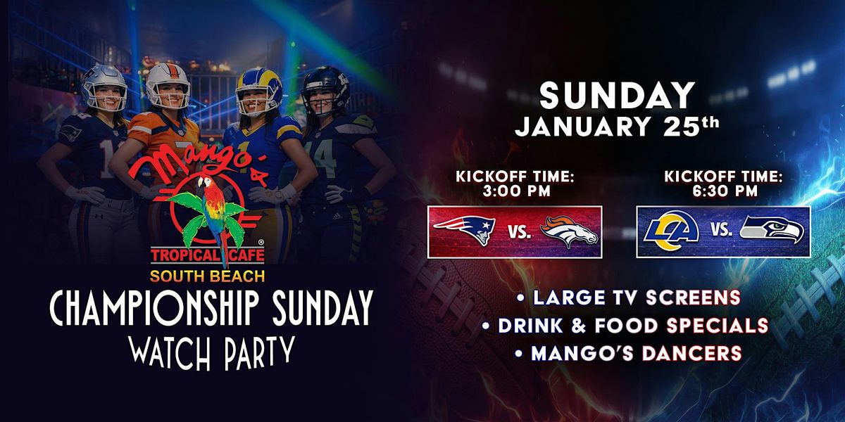 Join us at Mangoโs South Beach on Sunday, January 25, 2026 for the ultimate AFC & NFC Championship Game Watch Party!