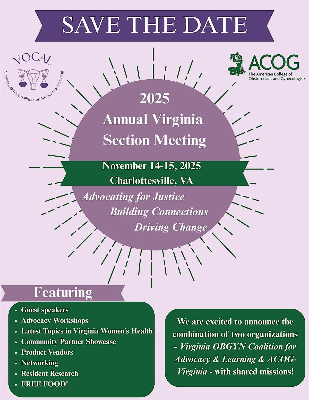 We are excited to announce a joint meeting for the ACOG Virginia Section and Virginia OBGYN Coalition for Advocacy and Learning.