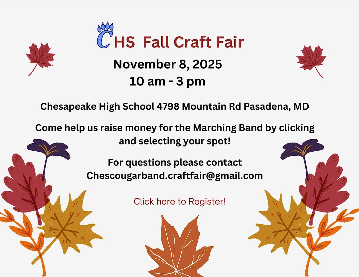 Chesapeake High School Band Boosters will host its annual Fall Craft Fair on November 8, 2025. The fair brings in more than 270 vendors selling arts & crafts, jewelry, cosmetics, glassware, woodworks, holiday items, clothing and many other items.