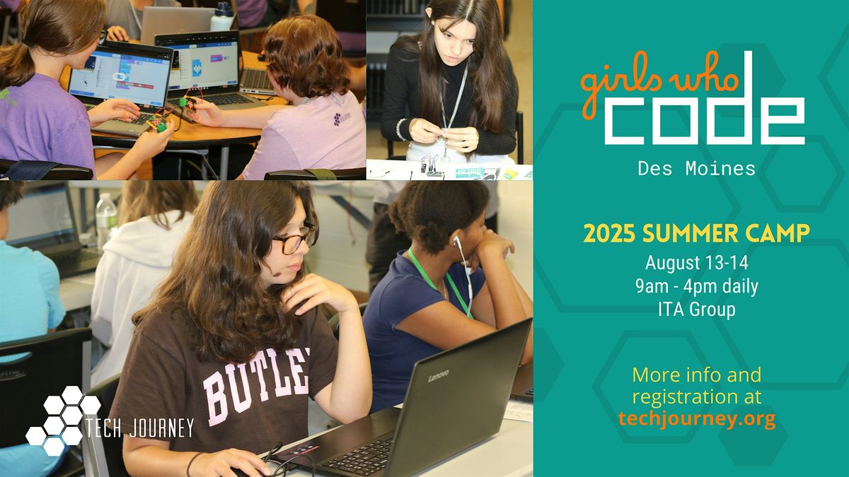 The Girls Who Code Des Moines 2025 Summer Camp will take place on Wednesday, August 13 and Thursday, August 15, 2024, from 9am to 4pm each day at ITA Group.
